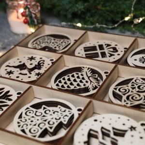 Minimalistinio stiliaus Kalėdinių eglutės žaisliukų rinkinys. Šis eglutės papuošimų rinkinys yra pagamintas iš beržo medienos plokštės. Po išpjovimo kiekvienas Kalėdinis žaisliukas šlifuojamas rankomis. Mediniai Kalėdiniai eglutės žaisliukai įgauna unikalumo ir žavesio, kadangi beržo medienos plokštės raštas nesikartoja, dėl to visi mediniai eglės papuošimai yra unikalūs. Tai ne tik puiki dovana šventėms, bet ir jauki interjero dekoro detalė Jūsų namams.