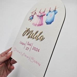 Metrika pagaminta iš medžio, papuošta gražiu bei išskirtiniu dizainu. Ant jo puikuojasi iškiliomis medinėmis raidėmis užrašytas vaiko vardas, taip pat surašyti duomenys: ūgis, svoris bei gimimo laikas. Tai puiki dovana, nežinant ką dovanoti naujagimiui arba tiesiog krikštynų proga!